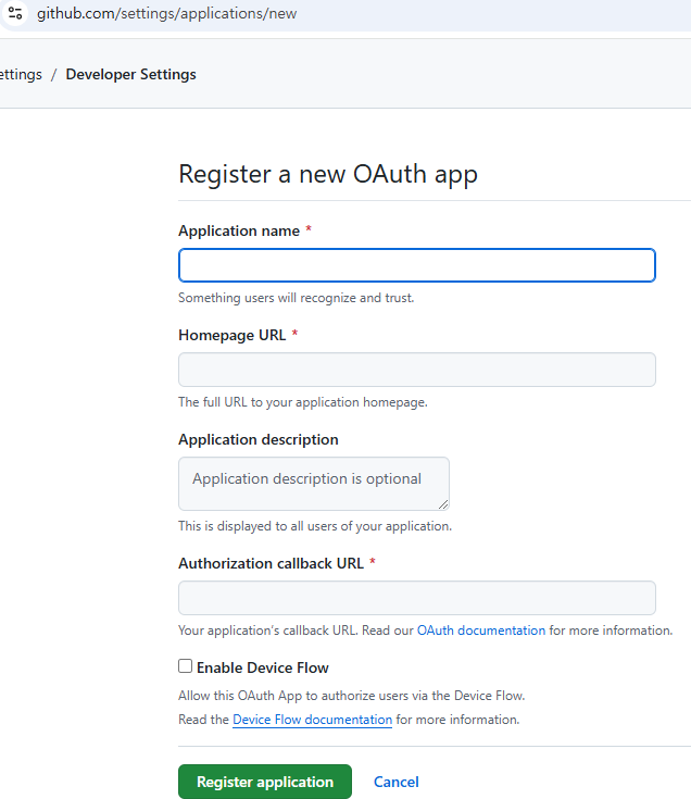 - github의 내 프로필 > Settings > Developer Settings > OAuth Apps > New OAuth App