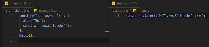 - 당연하겠지만 우린 최신 코드로 예쁘게 만들고 그걸 assets으로 보내 개구린 코드로 바뀐 main.js를 pug이 불러오는 흐름