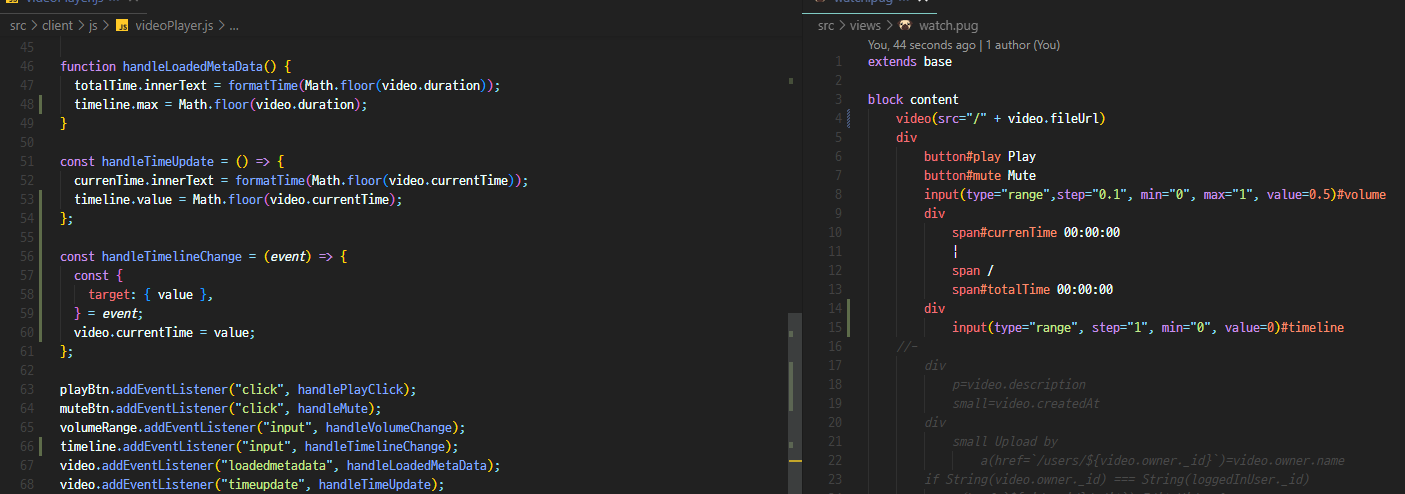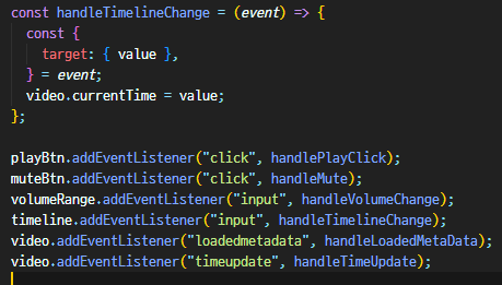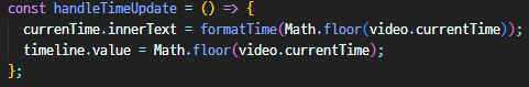 - handleTimeUpdate는 영상의 시간이 변경될때마다 감지되므로 이걸 사용