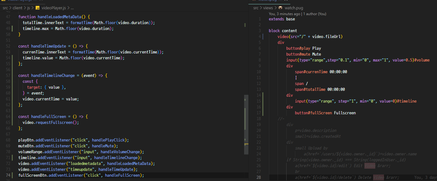 - 아직 완벽히 구현은 안됐는데, 이까지만 먼저 하고 다음에는 자바스크립트의 이벤트에 대해 더 다뤄볼거임 - https://github.com/Daniel-Jeon/wetube-loaded/commit/c8eb5e25b7018eda8df0fd4f13b16d92fcfba1e1