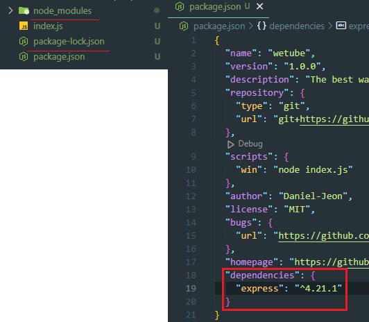 - npm i express 로 실행하지 않아도 npm에서 package.json의 dependencies를 추적하여 패키지를 다시 설치
