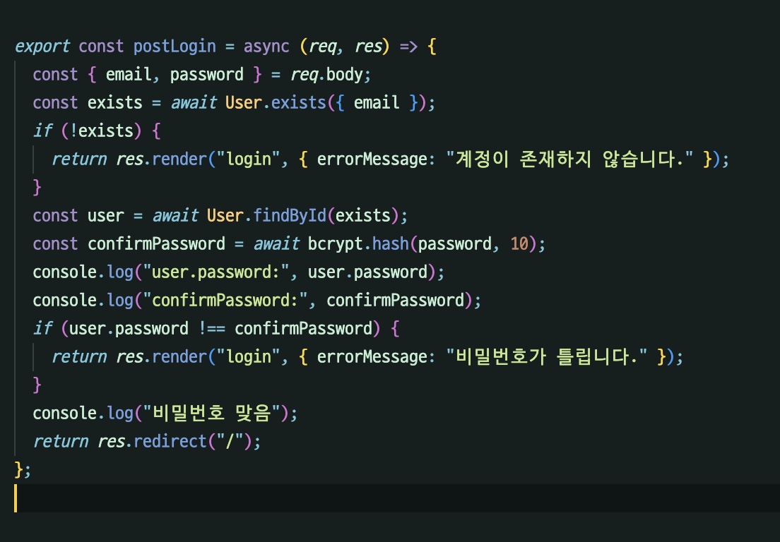 해싱화된 비밀번호와 대조하는 시간이 필요한데 await을 사용하지 않으니 로그로 pending이 나옴